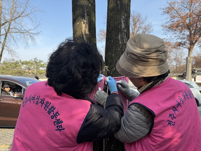 10일 오전 한옥마을 태조로에 있는 나무에는 시민들이 매미처럼 매달려 있었다. 이들이 지나갔다 하면 휑하던 나무도 금세 예쁜 옷으로 단장됐다. 나무 둘레가 큰 탓에 두세 사람이 미리 준비한 뜨개 옷을 잡고, 한 사람이 바늘을 여러 차례 오가는 방식으로 작업했다.