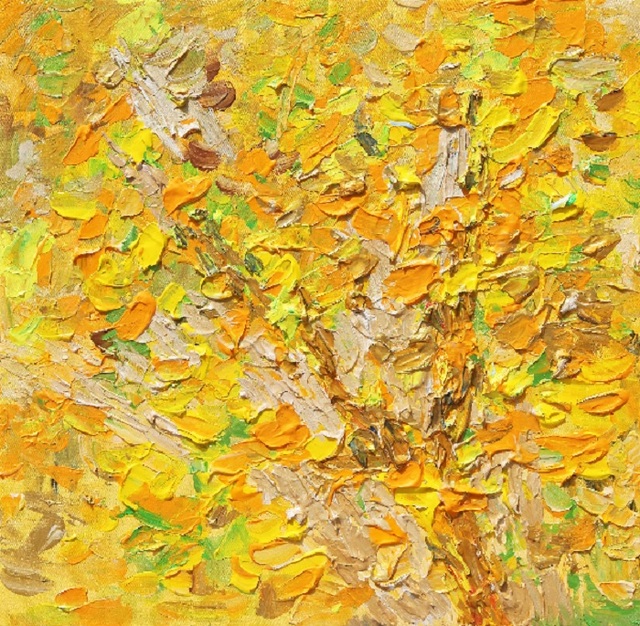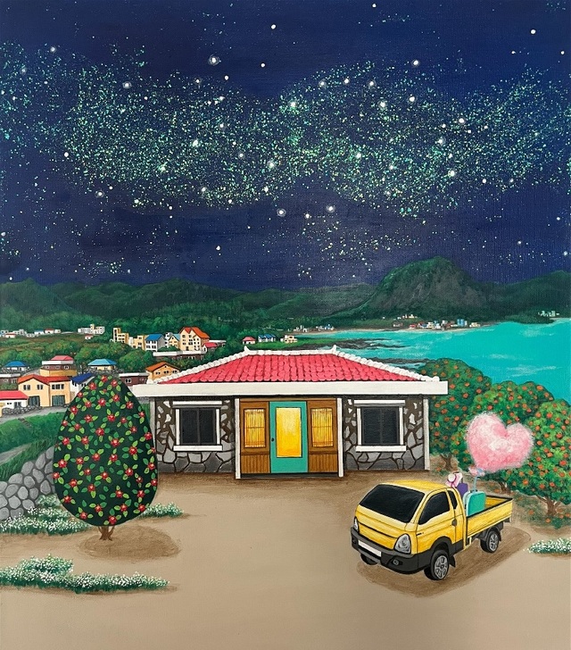 별이 쏟아지는 밤하늘 아래 빨간 지붕을 얹은 단층주택이 보인다. 나무와 돌담에 둘러싸인 건물 뒤로 바다 마을 풍경이 펼쳐진다. 노란색 트럭과 아기자기한 꽃들이 눈길을 사로잡는다. 황혜정 작가의 작품 ‘마음이 머무는 자리’이다. 따뜻하고 맑은 시선으로 숲과 꽃을 화폭에 옮겨 보는 이에게 행복감을 선물한다. 채도가 다른 노란 물감들이 덕지덕지 붙어 있다. 언뜻 보면 추상화를 보는 듯한데, 자세히 들여다보니 풍성한 질감이 살아 있는 노란색 은행나무가 떠오른다.김미라 작가가 그린 ‘자화상-여행 완산구 은행로 은행나무’이다