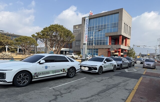 장수군의회 앞 갓길에 택시들이 줄지어 서있다.        /사진=이재진 기자