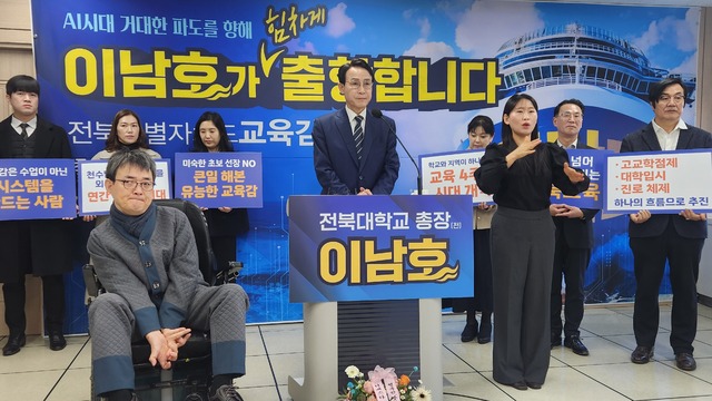 이남호 전 총장은 18일 전북교육청 브리핑룸에서 기자회견을 열고 “저 이남호는 전북대를 명문대학의 반열에 올려놓은 경험이 있다”며 “가장 한국적인 캠퍼스로 바꿨으며, 모두가 불가능할 것이라던 약학대학 유치 기반도 만들었다”고 밝혔다.