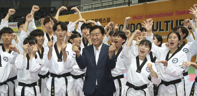2022년 무주에서 열린 제15회 세계태권도 문화엑스포에서 김관영 전북특별자치도지사가 참가자들과 포즈를 취하고 있다. /사진=전북도