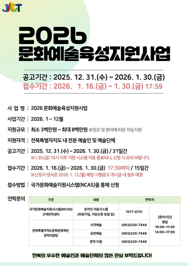 전북특별자치도문화관광재단(대표이사 이경윤)에서 ‘2026 문화예술 육성지원사업’ 공모를 추진한다고 4일 밝혔다.