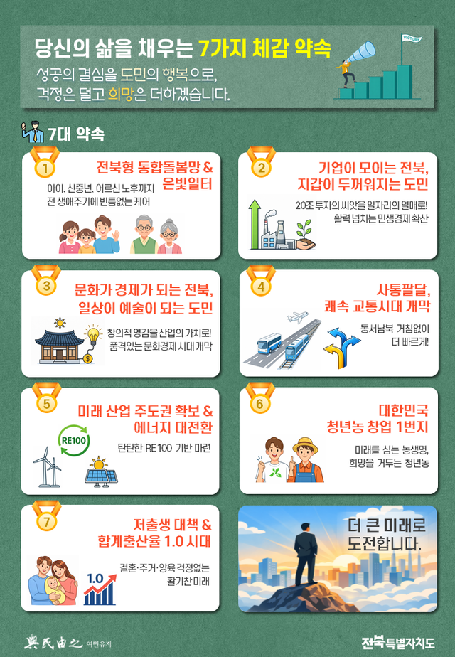 궁극적으로 도정의 목표는 사람이다. 필수의료 확충, 전북형 통합돌봄, 첨단 재난대응 시스템, 문화·관광 정책, 저출생 대응까지 모든 정책은 정주 여건 개선으로 수렴된다.