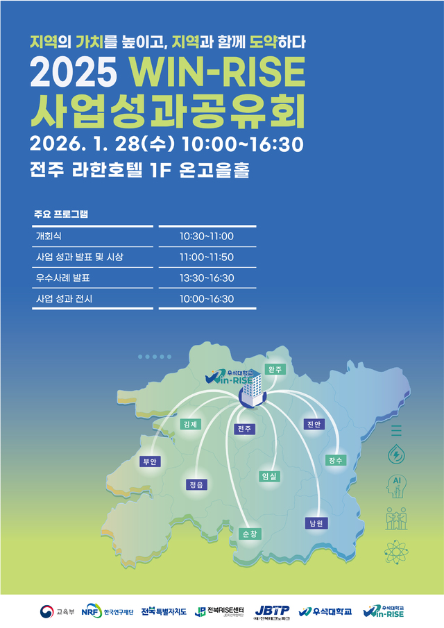 우석대학교(총장 박노준)가 오는 28일 라한호텔 전주 1층 온고을홀에서 ‘2025 WIN-RISE 사업 성과공유회’를 개최한다.