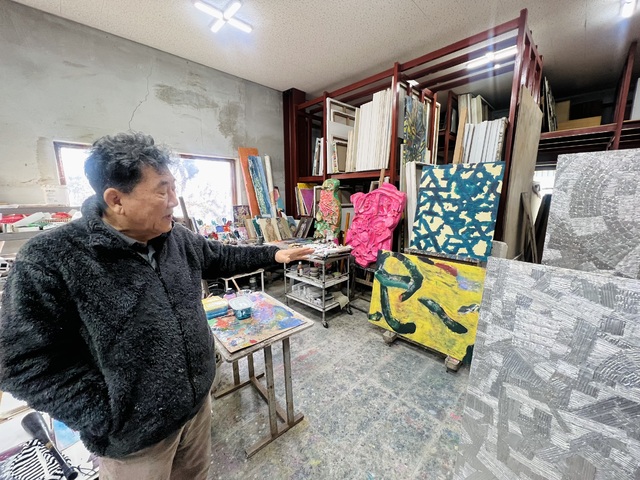 22일 유휴열미술관에서 만난 유휴열 화백이 작업 중인 작품에 대해서 설명하고 있다 / 사진=박은 기자
