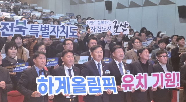 23일 군산시청에서 열린 김관영 전북자치도지사의 ‘도민과 함께하는 2026년 시군 방문’ 행사에서 2036년 전주하계올림픽 유치 기원 퍼포먼스를 하고 있다./사진=문정곤 기자