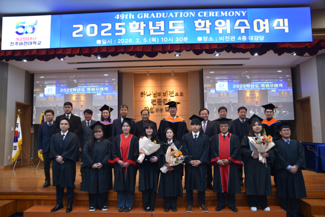 전주비전대학교는 5일 교내 비전관 대강당에서 ‘2025학년도 제49회 학위수여식’을 열고 전문학사 및 학사과정을 이수한 졸업생 1017명에게 학위를 수여했다.