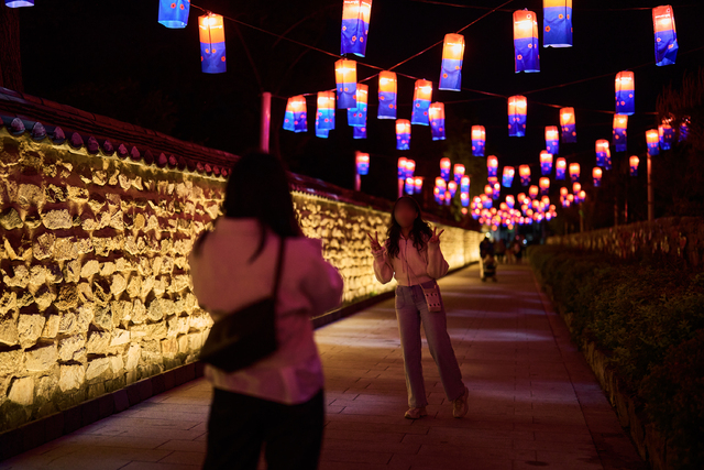 남원 광한루원 일대에 설치된 청사초롱 아래에서 관광객이 사진을 찍고 있다./사진=남원시