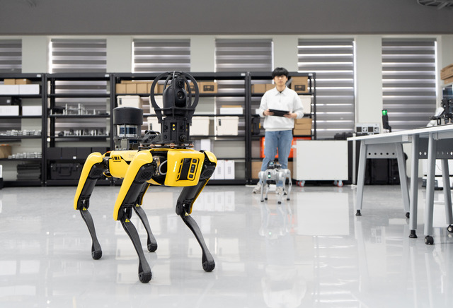 로봇 개가 사람의 지시를 받아 주변 환경을 촬영하고 있다.
