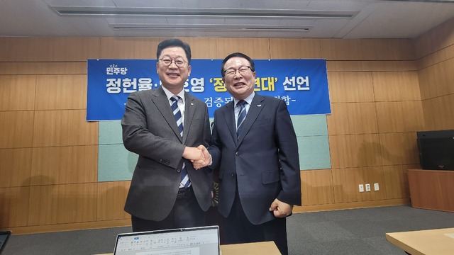 6·3 지방선거 전북특별자치도지사 선거에 나선 안호영 국회의원과 정헌율 익산시장이 사실상 단일화를 선언했다.