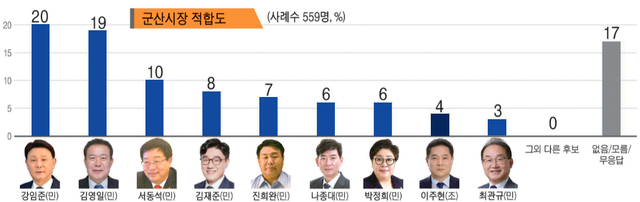 차기 군산시장 적합도 조사 결과 경쟁 주자들이 접전을 벌이고 있는 것으로 나타났다.
