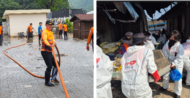 완주군 운주면 수해 복구 활동 중인 민국열 회장(왼쪽)과 정읍시 소성면 산불 피해 현장 봉사 중인 김성순 회장 /전북소방본부