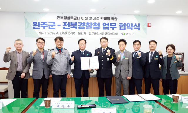 이날 협약에 따라 완주군은 부지 확보 및 인허가 절차를 적극 지원하며, 전북경찰청은 사업 추진 과정에서 지역 사회와 상생할 수 있도록 청사 건립 때 지역 업체 참여에 노력하기로 했다.