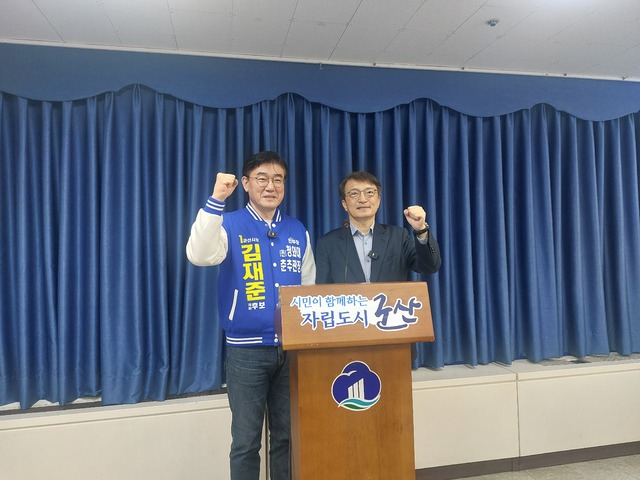 김 출마예정자와 김 예비후보는 8일 시청 브리핑실에서 기자회견을 열고 군산의 미래가 달린 현대차 9조 투자를 위해 정책을 중심으로 힘을 모으는 공조 체계를 구축하겠다고 밝혔다.