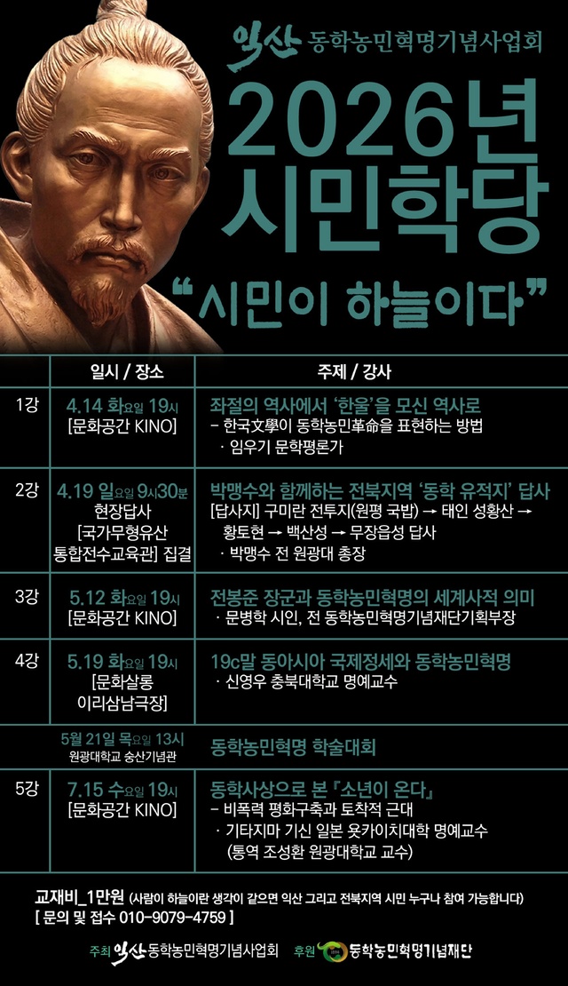 익산동학농민혁명기념사업회(대표 손인범)가 지난해 제1기 시민학당 운영에 이어 오는 14일부터 제2기 시민학당 명사 초청 강연회와 현장 답사를 진행한다.
