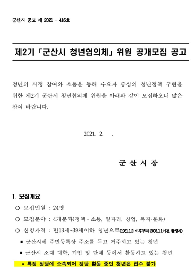 군산시 ‘청년협의체’ 공고문 신청 자격에 ‘정당활동 중인 청년은 접수 불가’라는 내용이 명시돼 있다./자료제공=군산시
