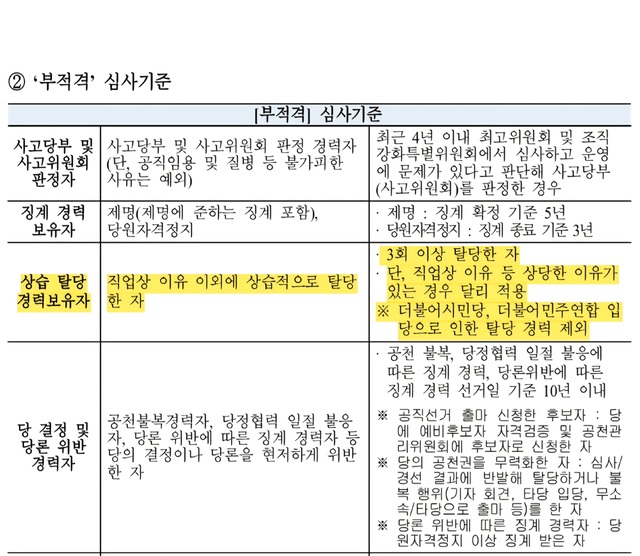 도당은 심사기준 공고에서 ‘3회 이상 탈당한 자’를 부적격 대상으로 규정하면서도 ‘직업상 이유 등 상당한 이유가 있는 경우 달리 적용한다’고 명시하고 있다.