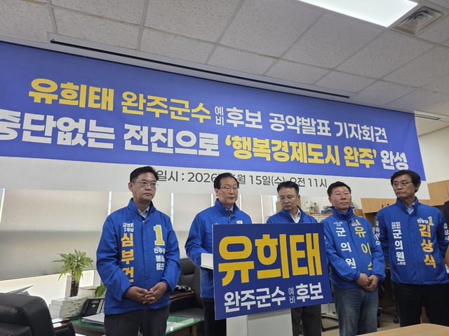유희태 예비후보는 이날 완주군청 브리핑룸에서 군의원 및 예비후보들과 동행하며 현직 군수로서의 탄탄한 조직력을 과시했다. 이 자리에는 완주군의회 김재천 부의장을 비롯해 유이수·심부건·최광호 의원과 김상식 예비후보가 함께해 유 후보의 재선 행보에 힘을 실었다. 유 후보는 이들 외에 이경애 완주군의회 의원, 신승기·이진영 군의원 예비후보도 정책연대를 하기로 했다고 밝혔다.