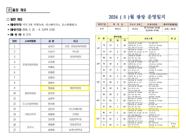 2024년 5월 말 전주시의회 해외 연수 일정·생활체육 광장 프로그램 운영 일지 대조.