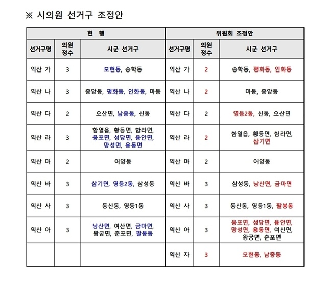 획정안에 따르면, 익산 자선거구(모현·남중, 3인)가 신설되면서 익산 가·나·라선거구 의원정수가 각각 3명에서 2명으로 1명씩 줄게 된다.