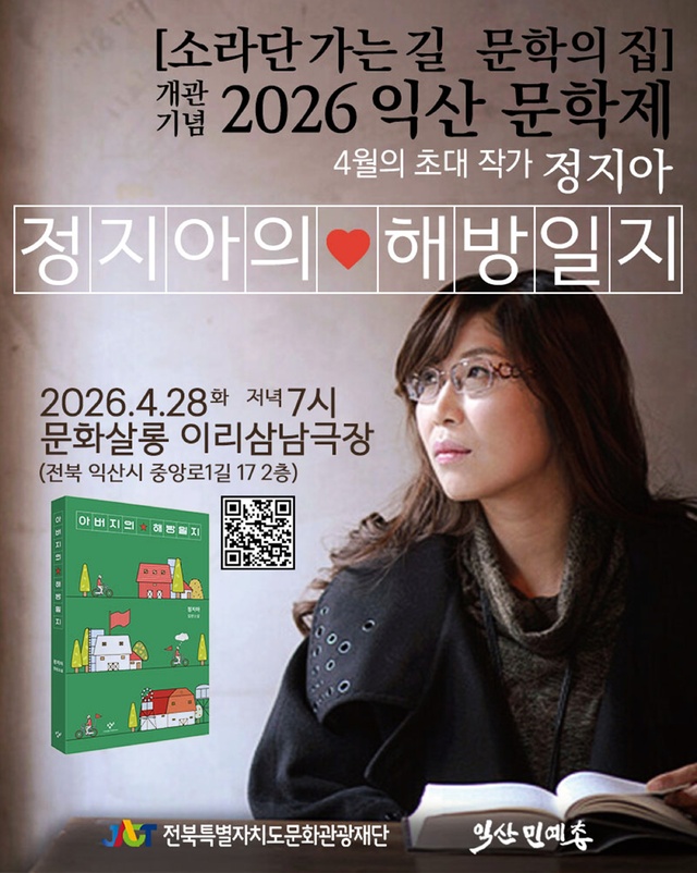 익산민예총, 초청 강연 ‘정지아의 해방일지’ 개최…28일 문화살롱 이리삼남극장 오는 6월 ‘소라단 가는 길 문학의 집’ 개관 기념…2026 익산 문학제 첫 번째 행사